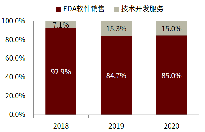 收入端持续高增,产品收入占比居高。在我国下游IC设计产品高速发展的驱动下,公司2018-2020年收入CAGR达到68.5%,2020年收入超过4亿元,其中约85%的收入来源于EDA工具软件销售,15%来自于专业技术服务,收入结构上与Synopsys相近。EDA软件销售主要是以期间授权的方式,授权具有一定的合同期限,也与Synopsys等海外厂商的商业模式类似,收入具有一定的持续性。